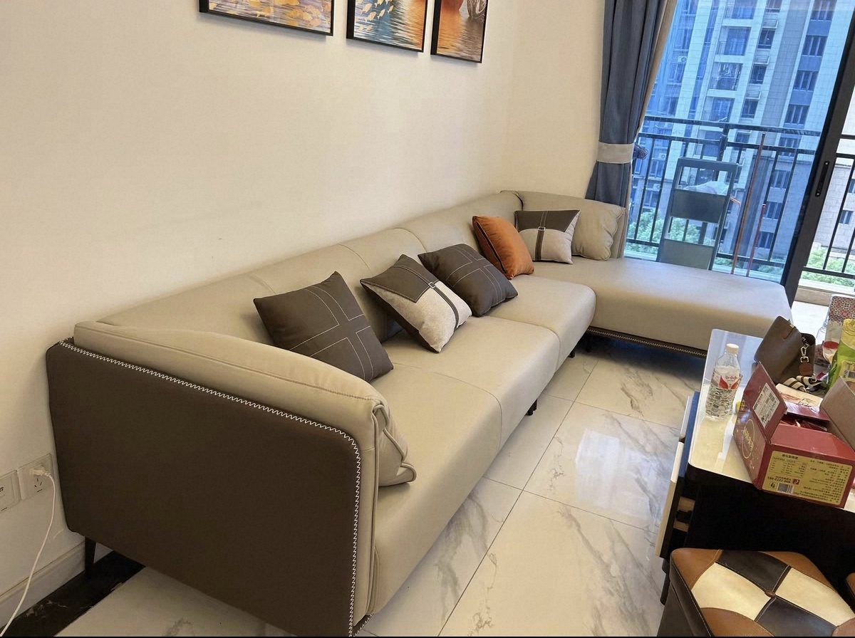 沙发的皮质,座垫的舒适度都挺好,而且刚收到到现在都没有闻到难闻的气味~朋友都说买的超值,他也想换一套这样子的颜色入手呢