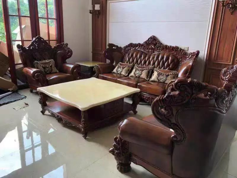 千匠一品欧式风格实木多层板+头层牛皮+橡木框架+高密度海绵+非接触面仿皮沙发8126-B