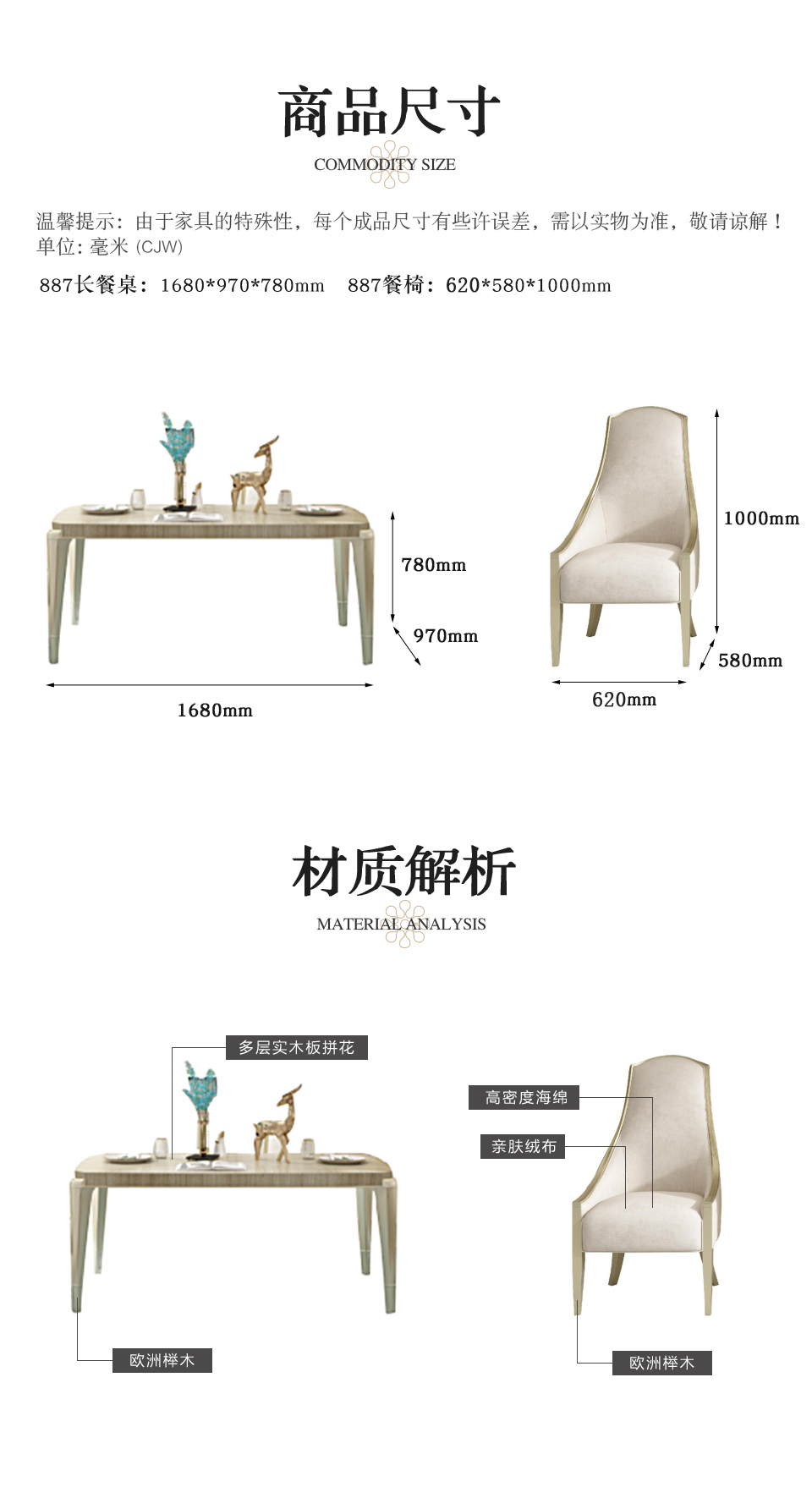 商品名称:【精品】千匠一品 美式轻奢优质亲肤绒布+高密度海绵+欧洲榉木餐椅887-H