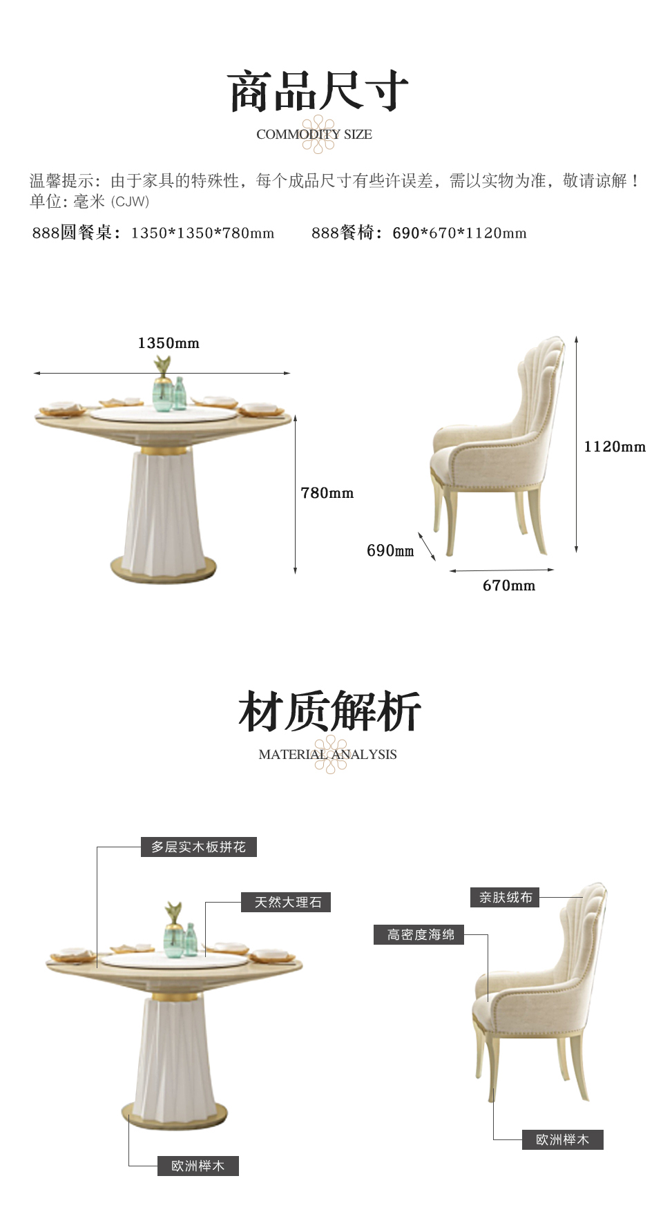 商品名称:△【精品】千匠一品 美式轻奢优质天然大理石+多层实木板拼花+欧洲榉木1.35m圆餐桌+转盘888-H