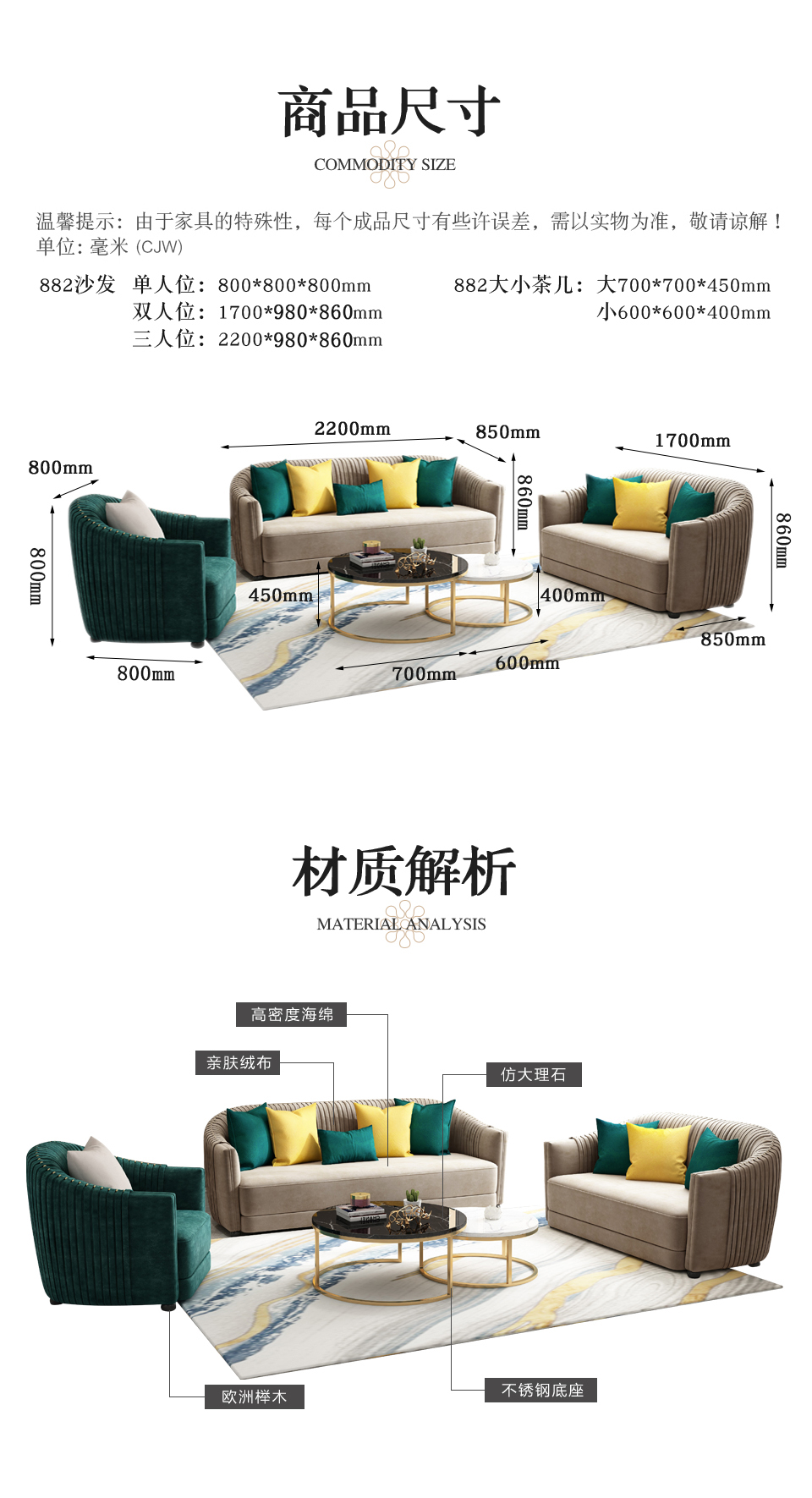 【精品】千匠一品 美式轻奢优质亲肤绒布+高密度海绵+欧洲榉木沙发882-H