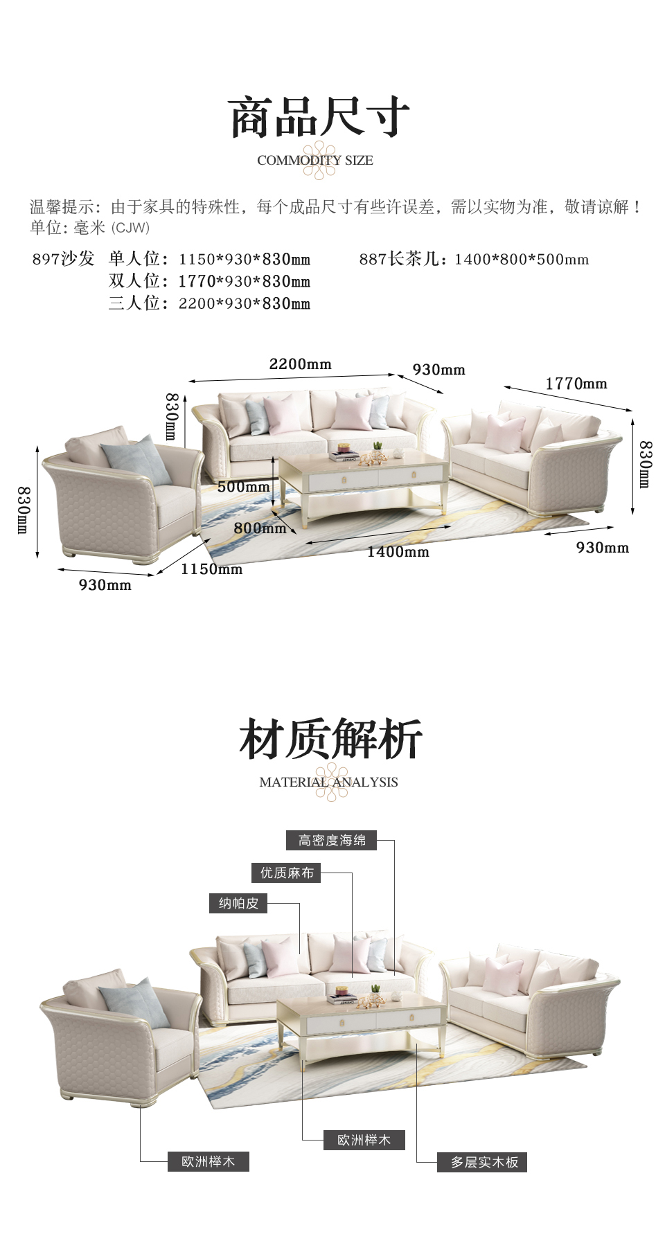 商品名称:【精品】千匠一品 美式轻奢优质麻布+纳帕皮+高密度海绵+欧洲榉木沙发897-H