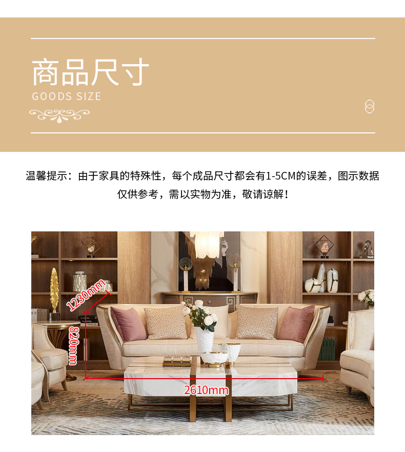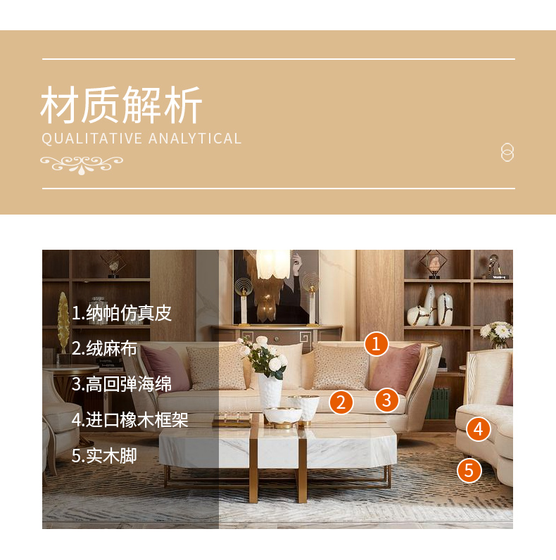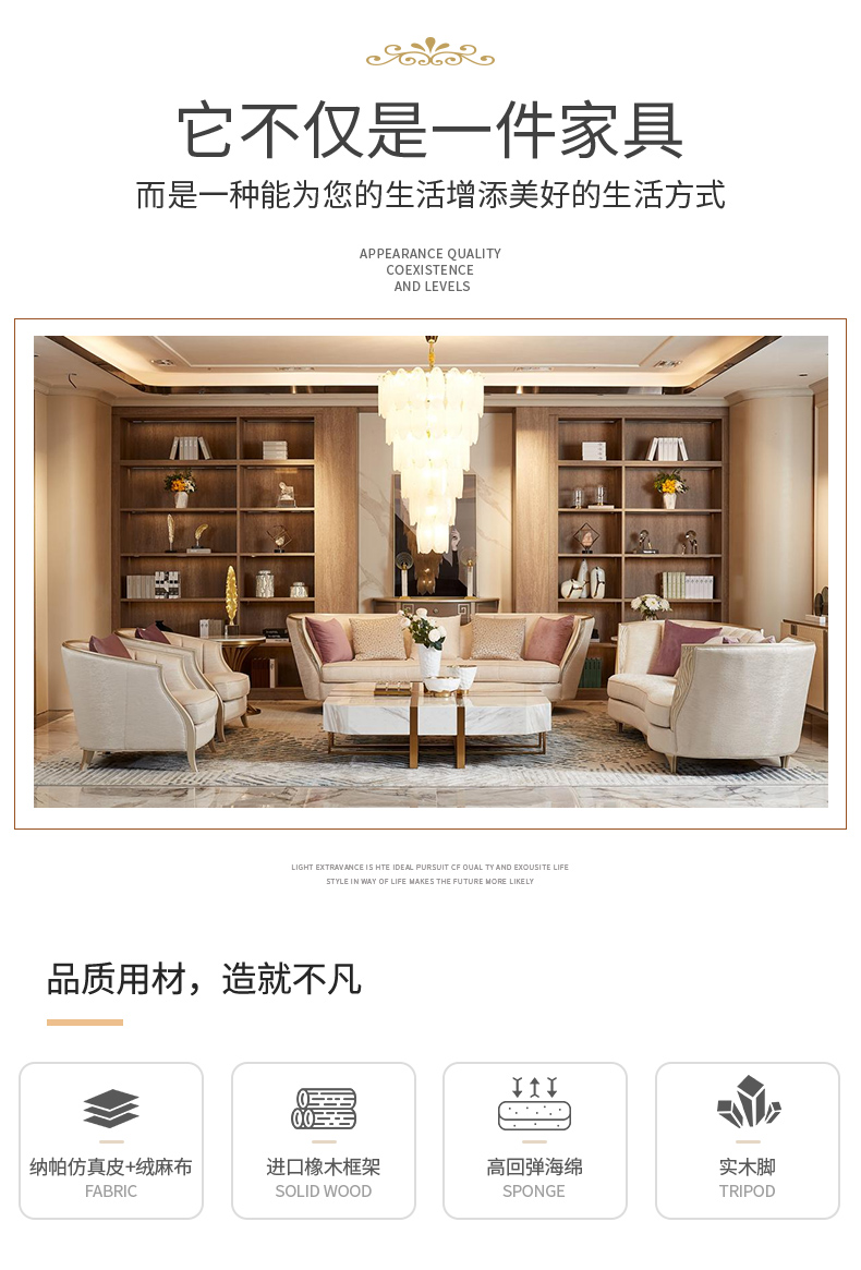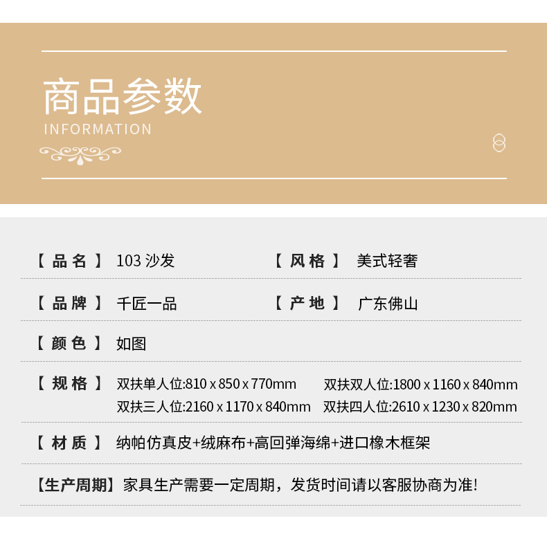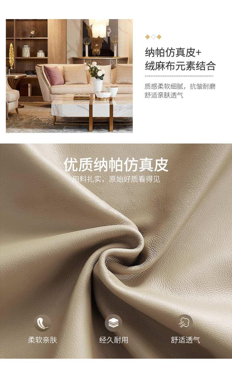 商品名称:△千匠一品 轻奢美式风格 纳帕仿真皮+绒麻布 高档大气沙发103沙发-X