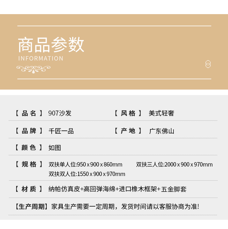 商品名称:△千匠一品 轻奢美式风格 纳帕仿真皮+绒麻布 高档大气沙发 907沙发-X