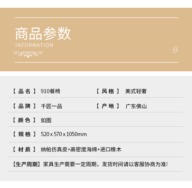 商品名称:△千匠一品 轻奢美式风格 纳帕仿真皮 高档大气餐椅 910餐椅-X