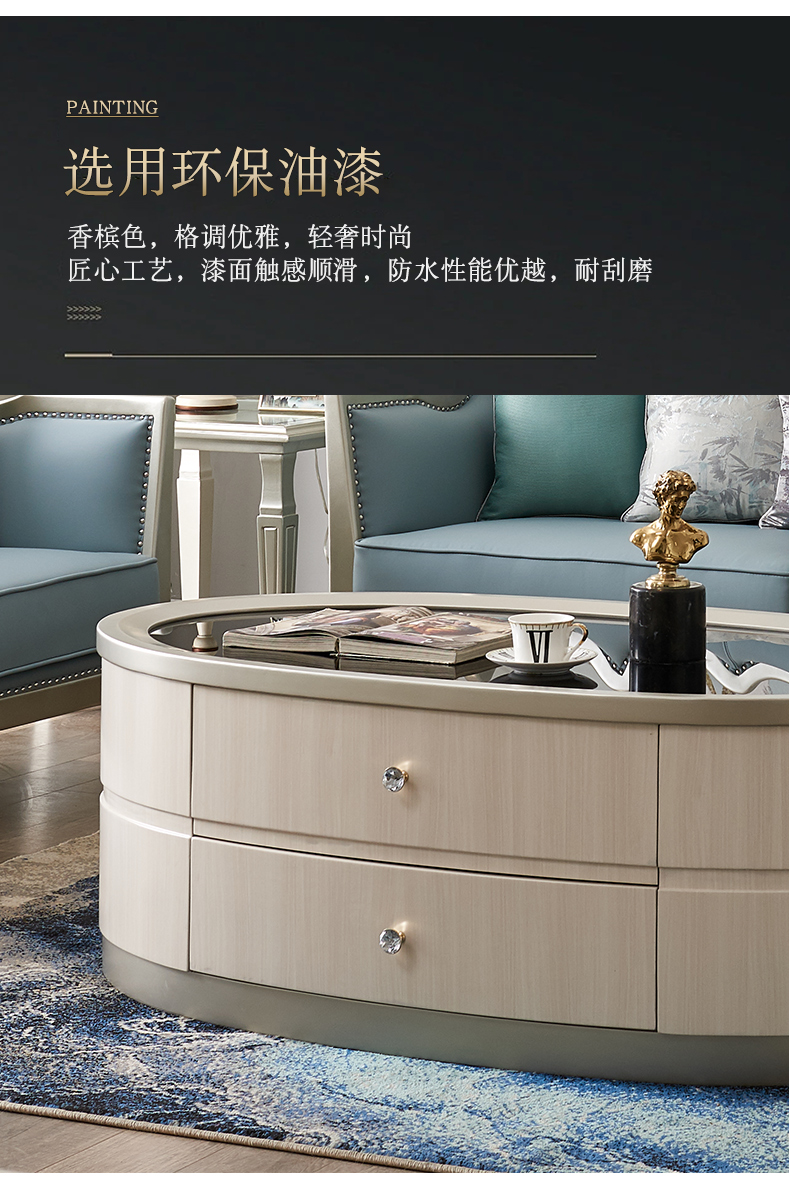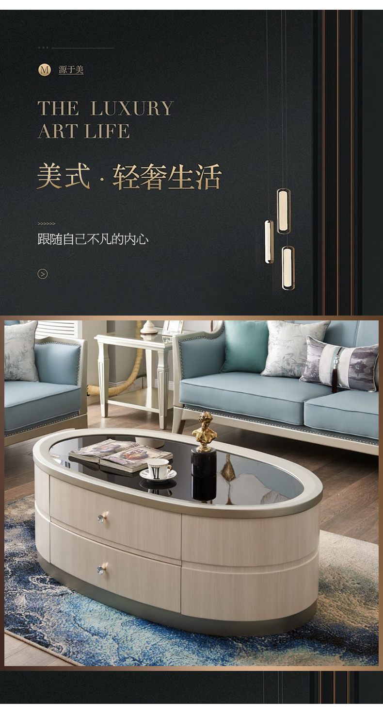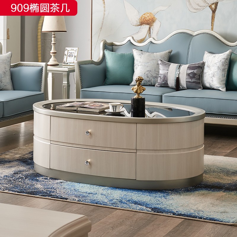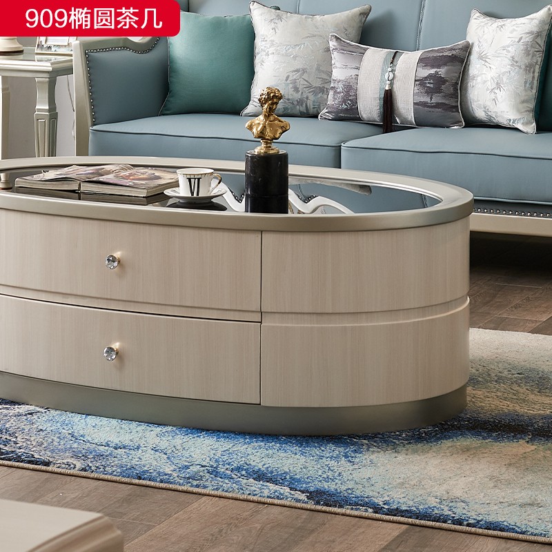 △千匠一品 轻奢美式风格 实木+实木多层+钢化玻璃 高档大气椭圆茶几909椭圆茶几-X