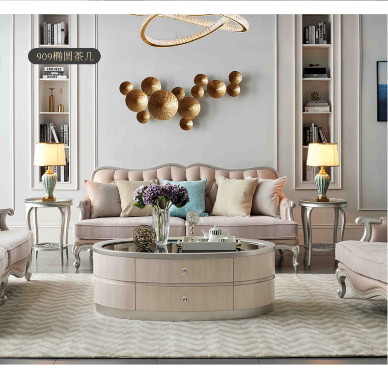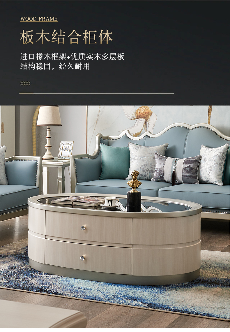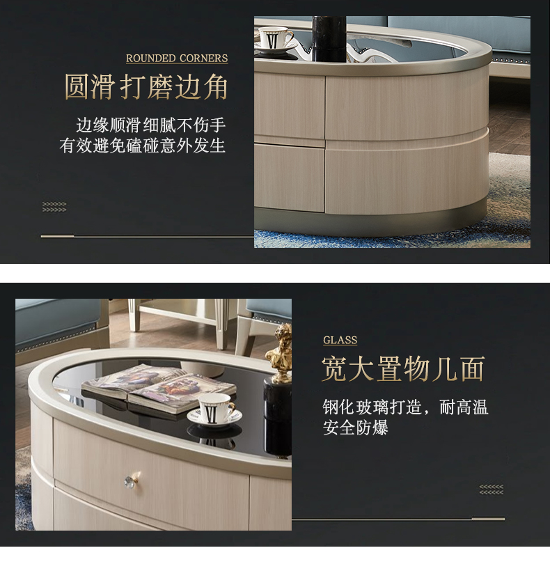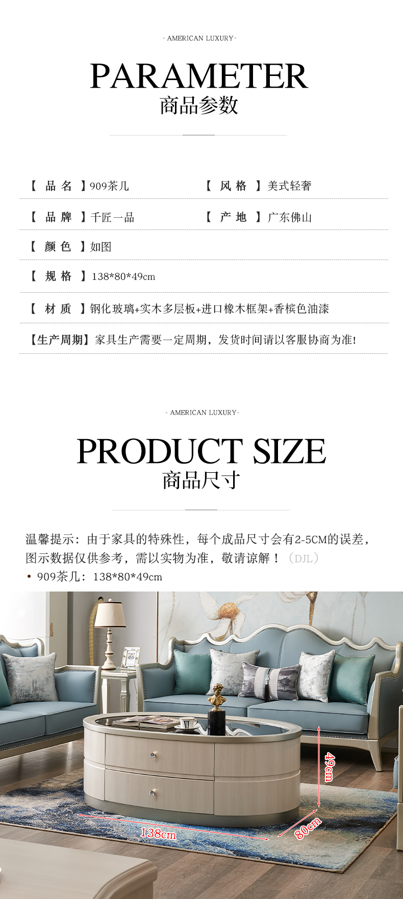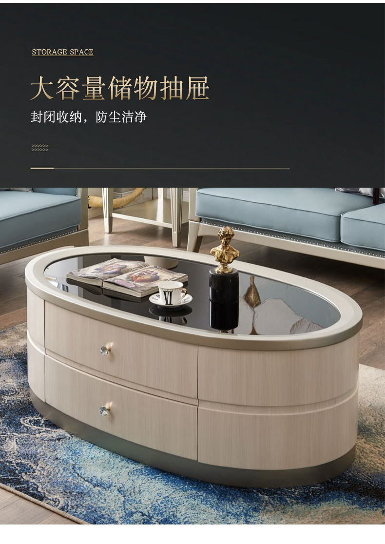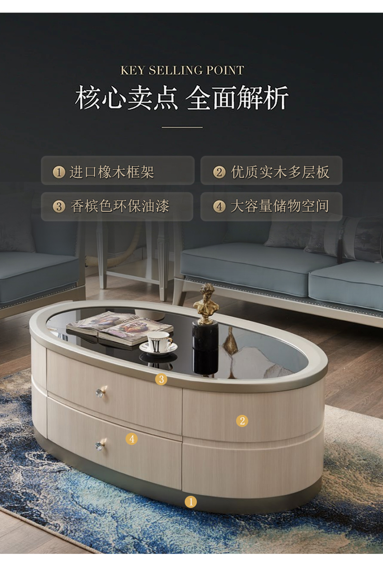 商品名称:△千匠一品 轻奢美式风格 实木+实木多层+钢化玻璃 高档大气椭圆茶几909椭圆茶几-X