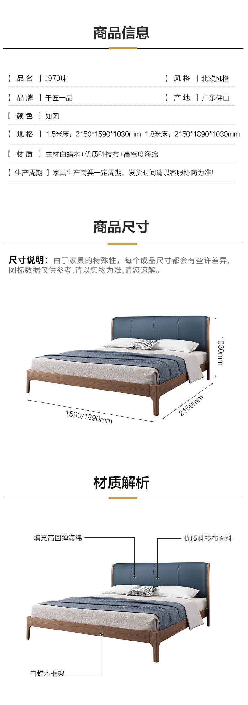 商品名称:千匠一品 北欧风格 白蜡木+高密度海绵+优质科技布 高档大气床 1970床-X