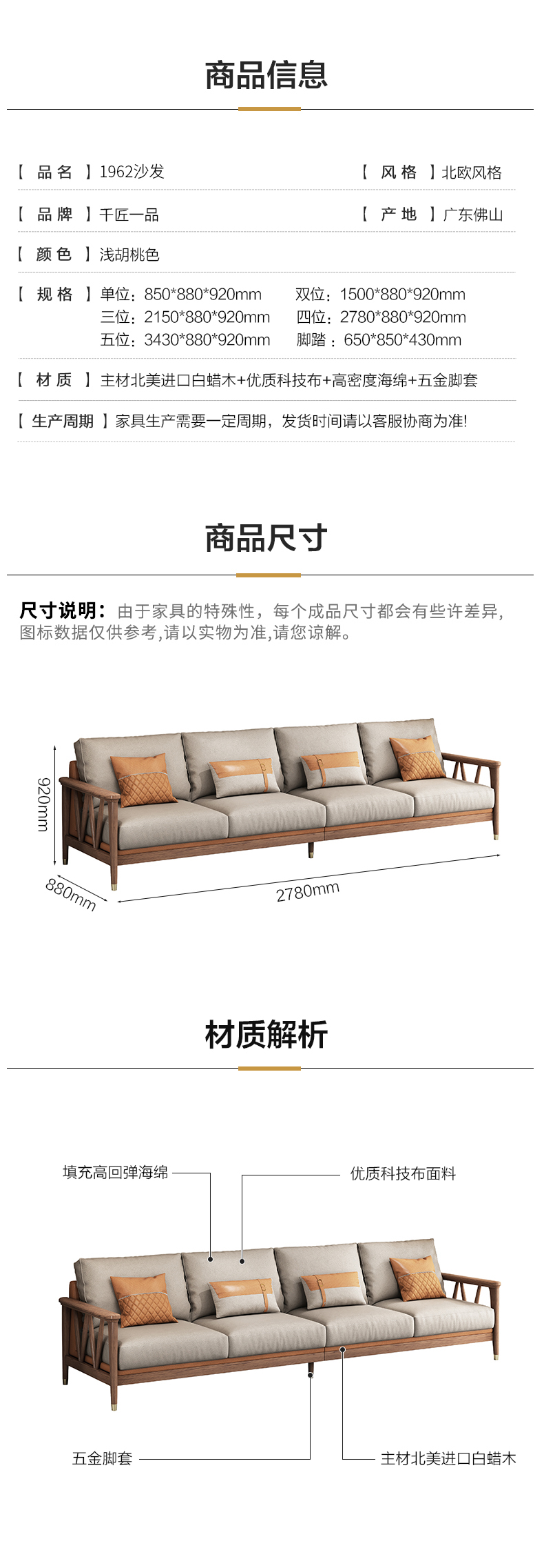 商品名称:千匠一品 北欧风格 北美进口白蜡木+优质科技布+高密度海绵 高档大气沙发 1962沙发-X