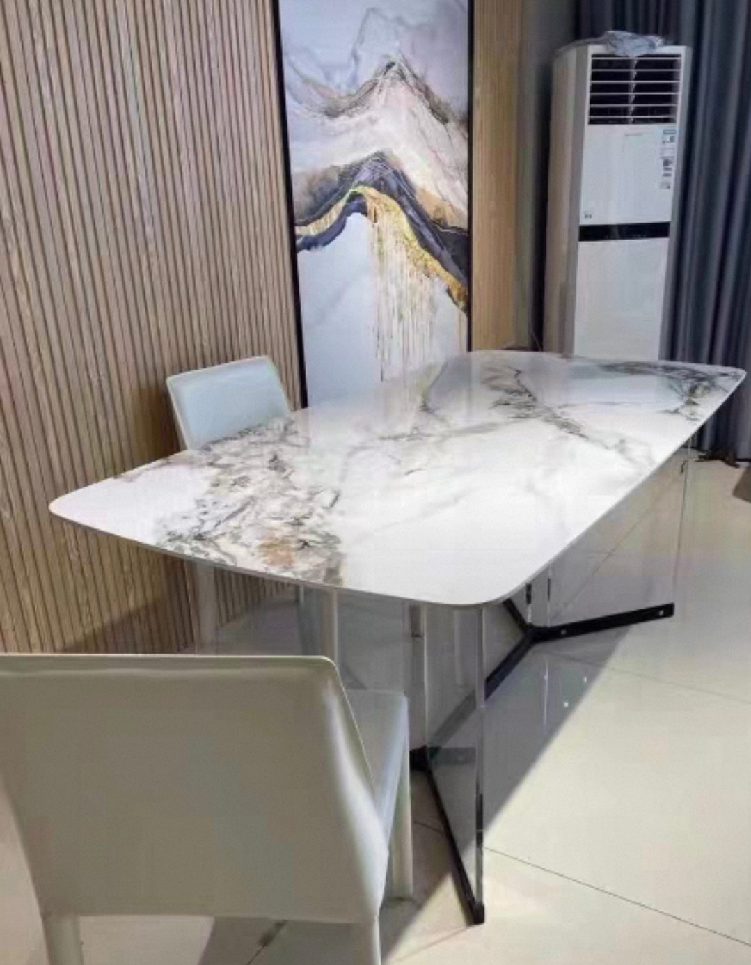 千匠一品 意式风格 羊脂白玉亮光奢石岩板+钢化玻璃+灰色不锈钢五金底座 高档大气餐台 578餐台-X