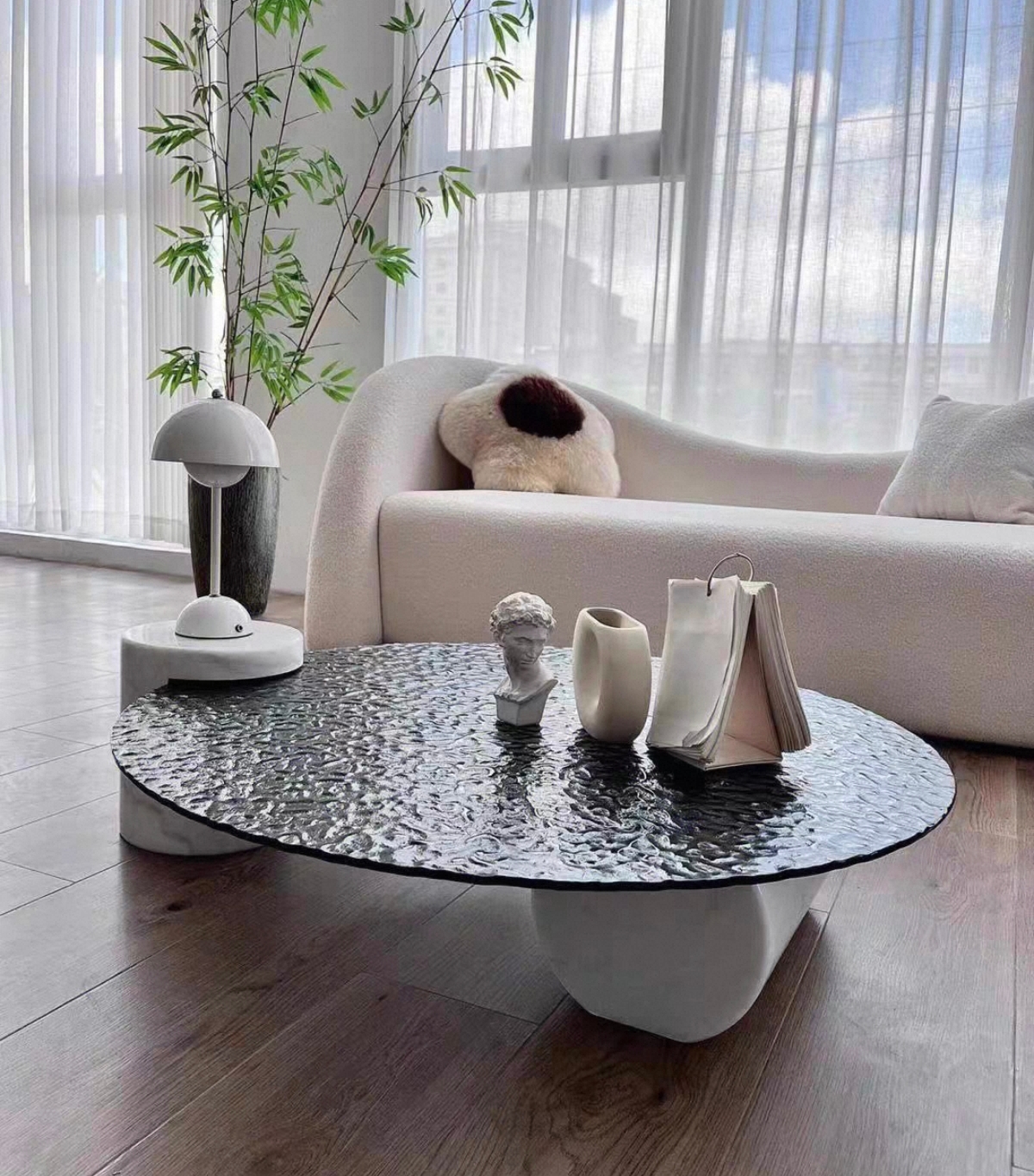 千匠一品 意式风格 爵士白大理石纹饰面+灰色透明水波纹钢化玻璃 高档大气茶几 513茶几-X