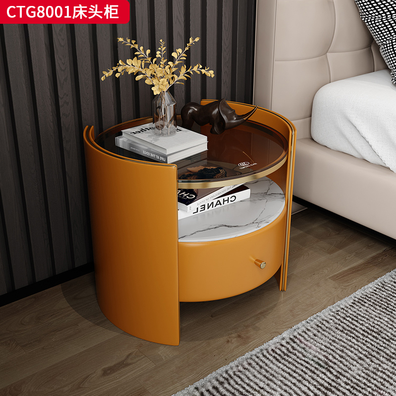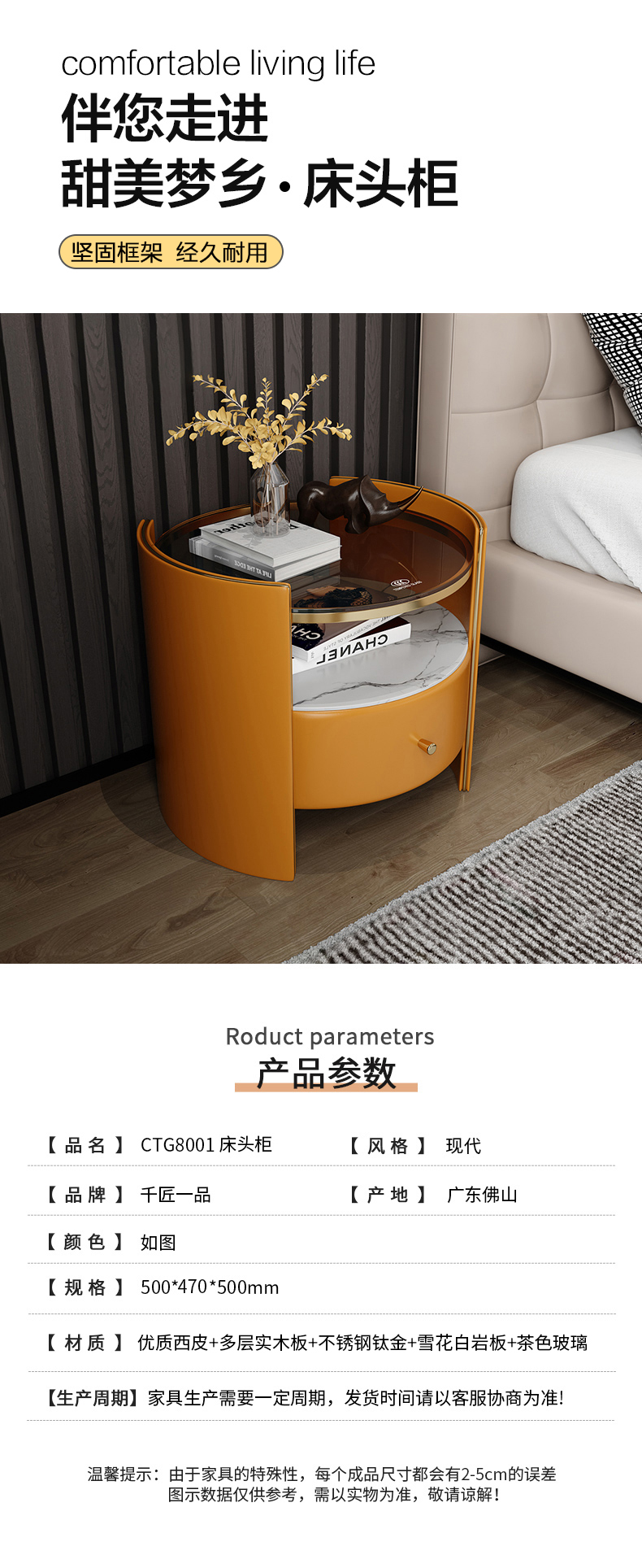 千匠一品 现代风格 优质西皮+多层实木板+不锈钢钛金+雪花白岩板+茶色玻璃 时尚大气床头柜CTG8001-J