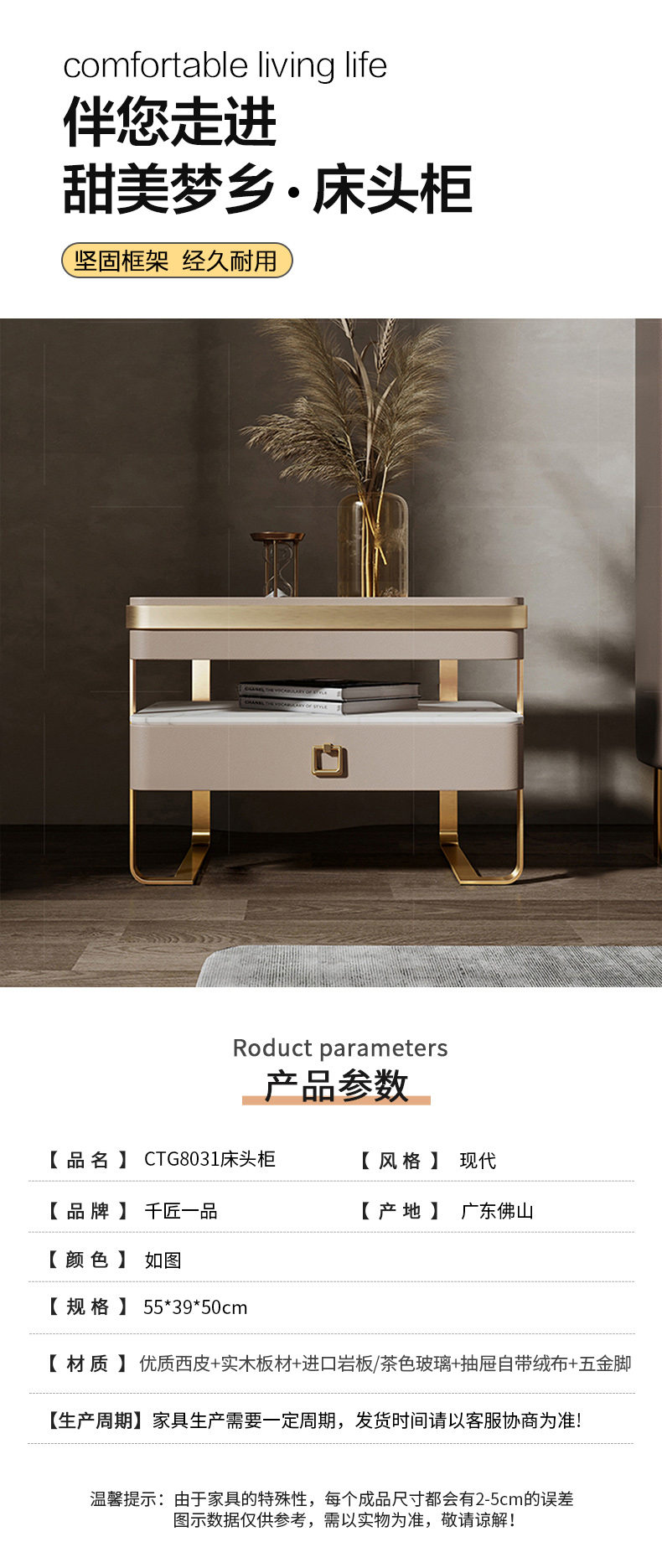 商品名称:千匠一品 现代风格 优质西皮+实木板材+进口岩板 茶色玻璃+抽屉自带绒布+五金脚 时尚大气床头柜CTG8031-J