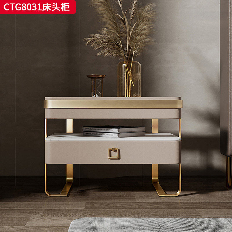 千匠一品 现代风格 优质西皮+实木板材+进口岩板 茶色玻璃+抽屉自带绒布+五金脚 时尚大气床头柜CTG8031-J