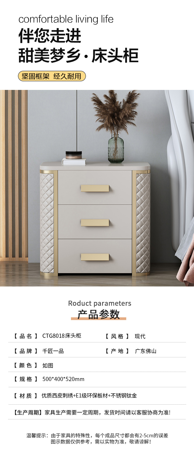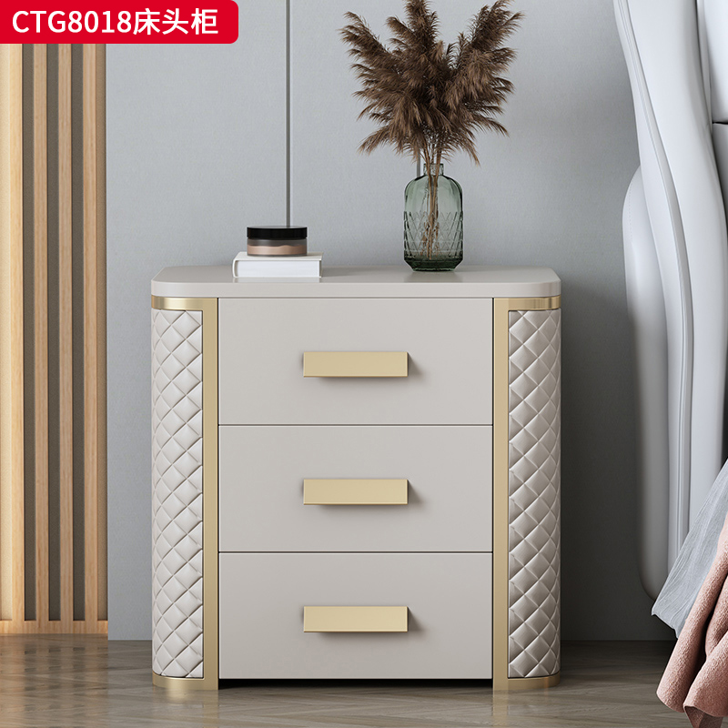 千匠一品 现代风格 优质西皮刺绣+E1级环保板材+不锈钢钛金 时尚大气床头柜CTG8018-J