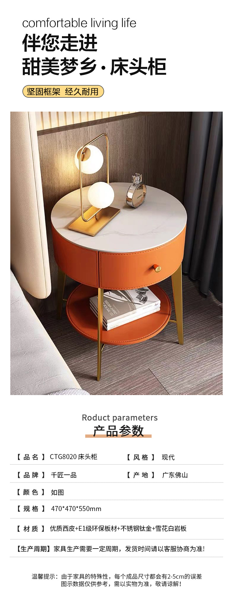 商品名称:千匠一品 现代风格 优质西皮+E1级环保板材+不锈钢钛金+雪花白岩板 时尚大气床头柜CTG8020-J