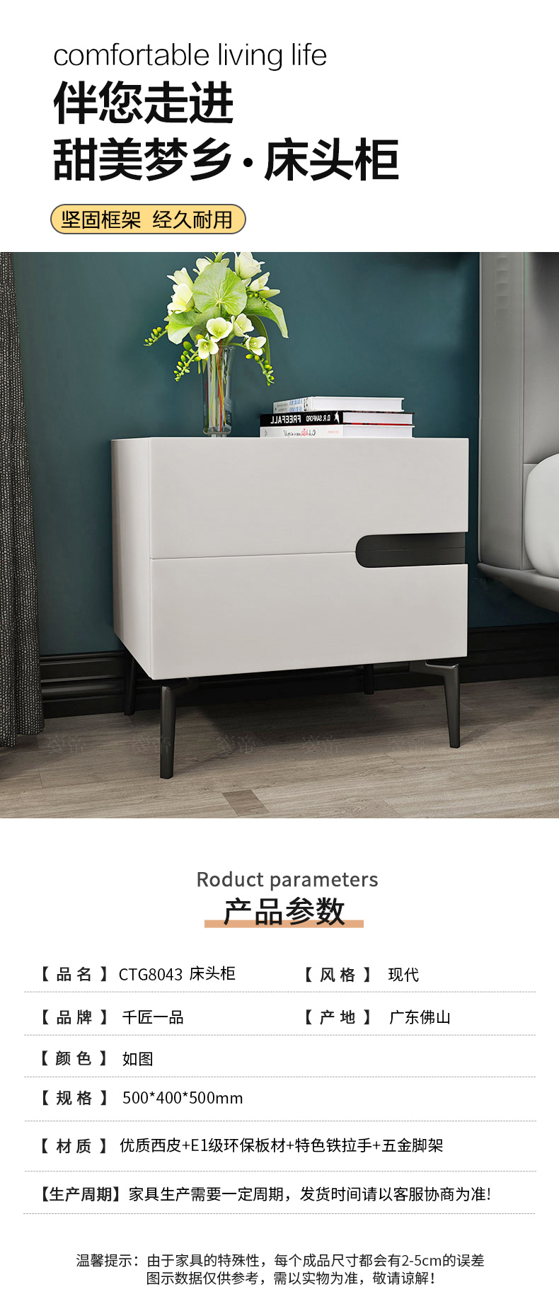 商品名称:千匠一品 现代风格 优质西皮+E1环保板材+特色铁拉手+五金脚架 时尚大气床头柜CTG8043-J
