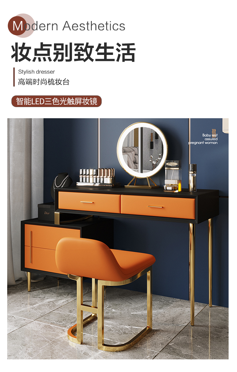 千匠一品 现代风格 优质西皮+实木板材+不锈钢钛金+智能LED三色光妆镜 时尚大气梳妆台SZT8019-J