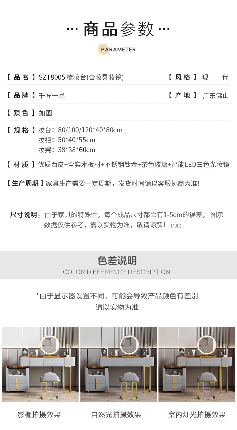 商品名称:千匠一品 现代风格 优质西皮+全实木板材+不锈钢钛金+茶色玻璃+智能LED三色光妆镜 时尚大气梳妆台SZT8005-J