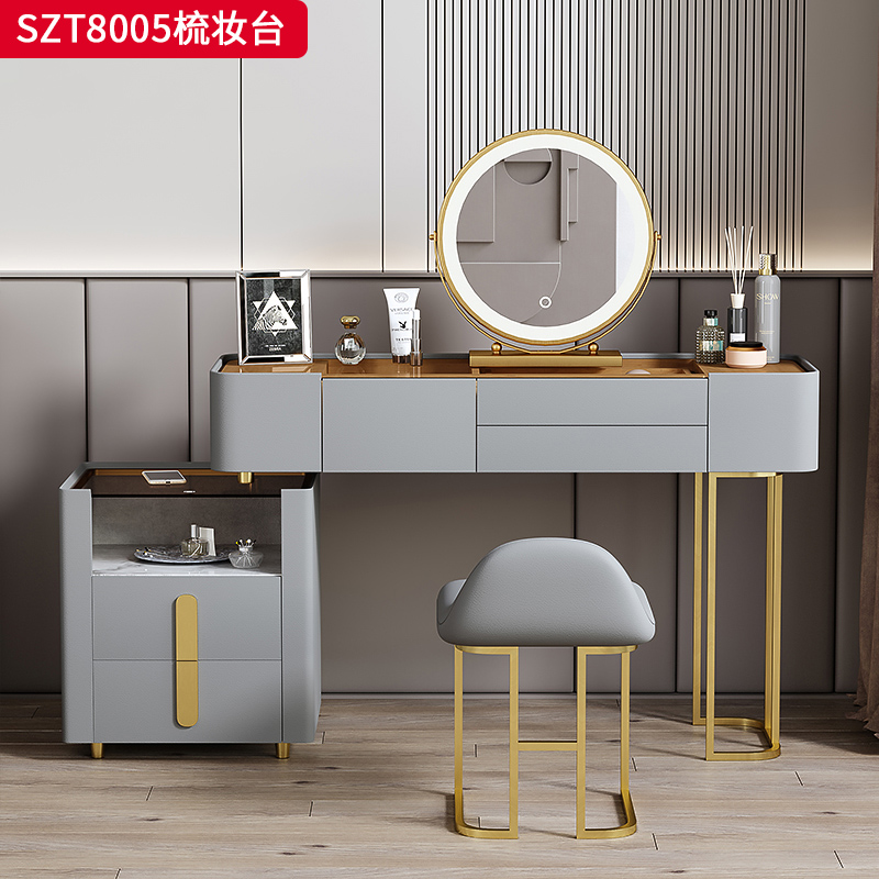 千匠一品 现代风格 优质西皮+全实木板材+不锈钢钛金+茶色玻璃+智能LED三色光妆镜 时尚大气梳妆台SZT8005-J