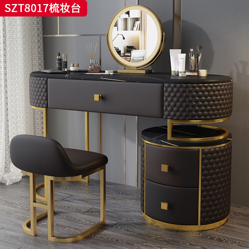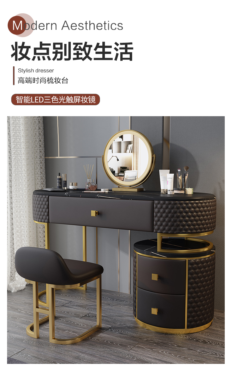 千匠一品 现代风格 优质西皮+多层实木板+不锈钢钛金+劳伦黑金岩板+智能LED三色妆镜 时尚大气梳妆台SZT8017-J