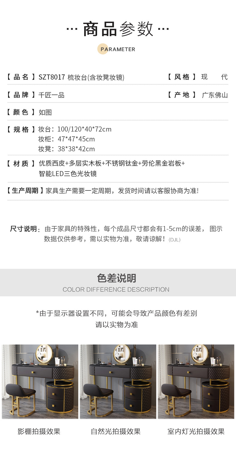 商品名称:千匠一品 现代风格 优质西皮+多层实木板+不锈钢钛金+劳伦黑金岩板+智能LED三色妆镜 时尚大气梳妆台SZT8017-J