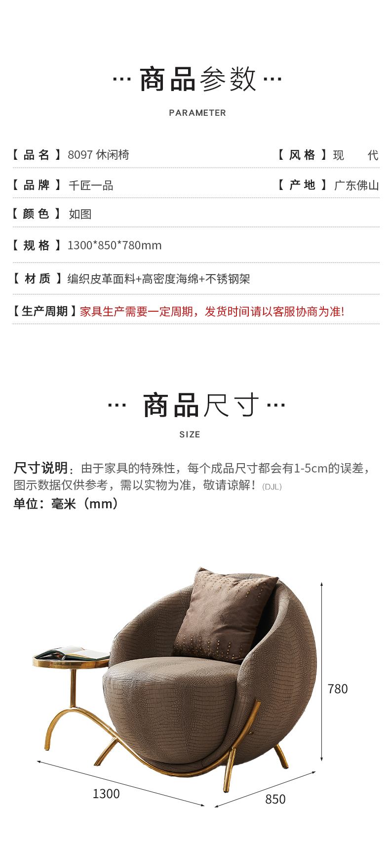 商品名称:千匠一品 现代风格 编织皮革面料+高密度海绵+不锈钢架 简约时尚休闲椅8097-L
