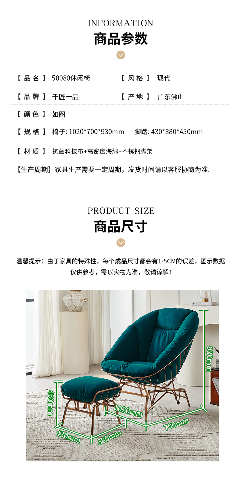 商品名称:千匠一品 现代风格 抗菌科技布+高密度海绵+不锈钢脚架 简约大气休闲椅50080-L