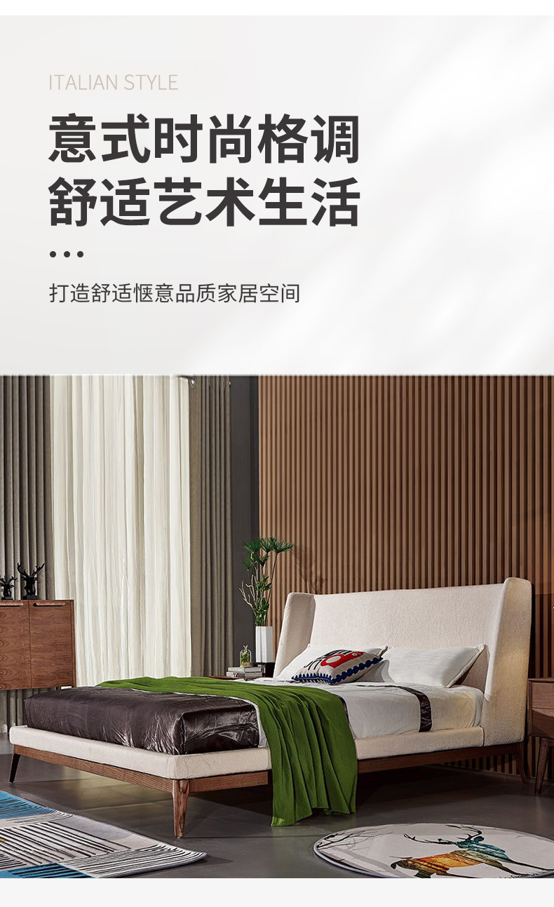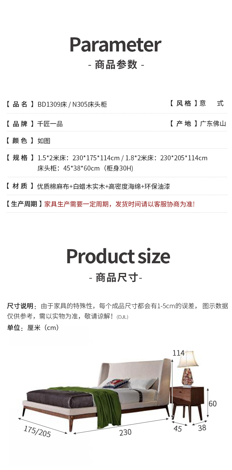商品名称:千匠一品 意式风格 优质棉麻布+白蜡木实木+高密度海绵+环保油漆 时尚大气床BD1309 床头柜N305-L