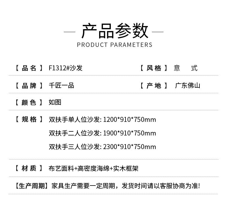 商品名称:千匠一品 意式风格 布艺面料+高密度海绵+实木框架 时尚大气沙发F1312-J