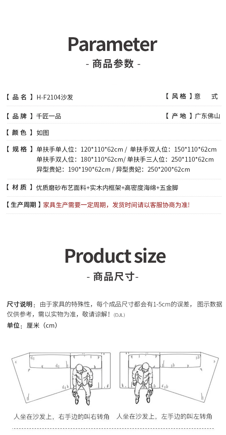 商品名称:千匠一品 意式风格 网红款沙发布达佩斯沙发 优质磨砂布艺面料+实木内框架+高密度海绵+五金脚 时尚大气沙发H-F2104-L