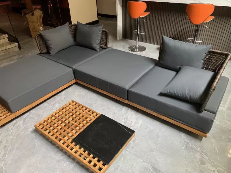 千匠一品 户外风格 柚木+铝合金+仿藤+户外防水布+高密度海绵 时尚大气KM沙发 方茶几-L