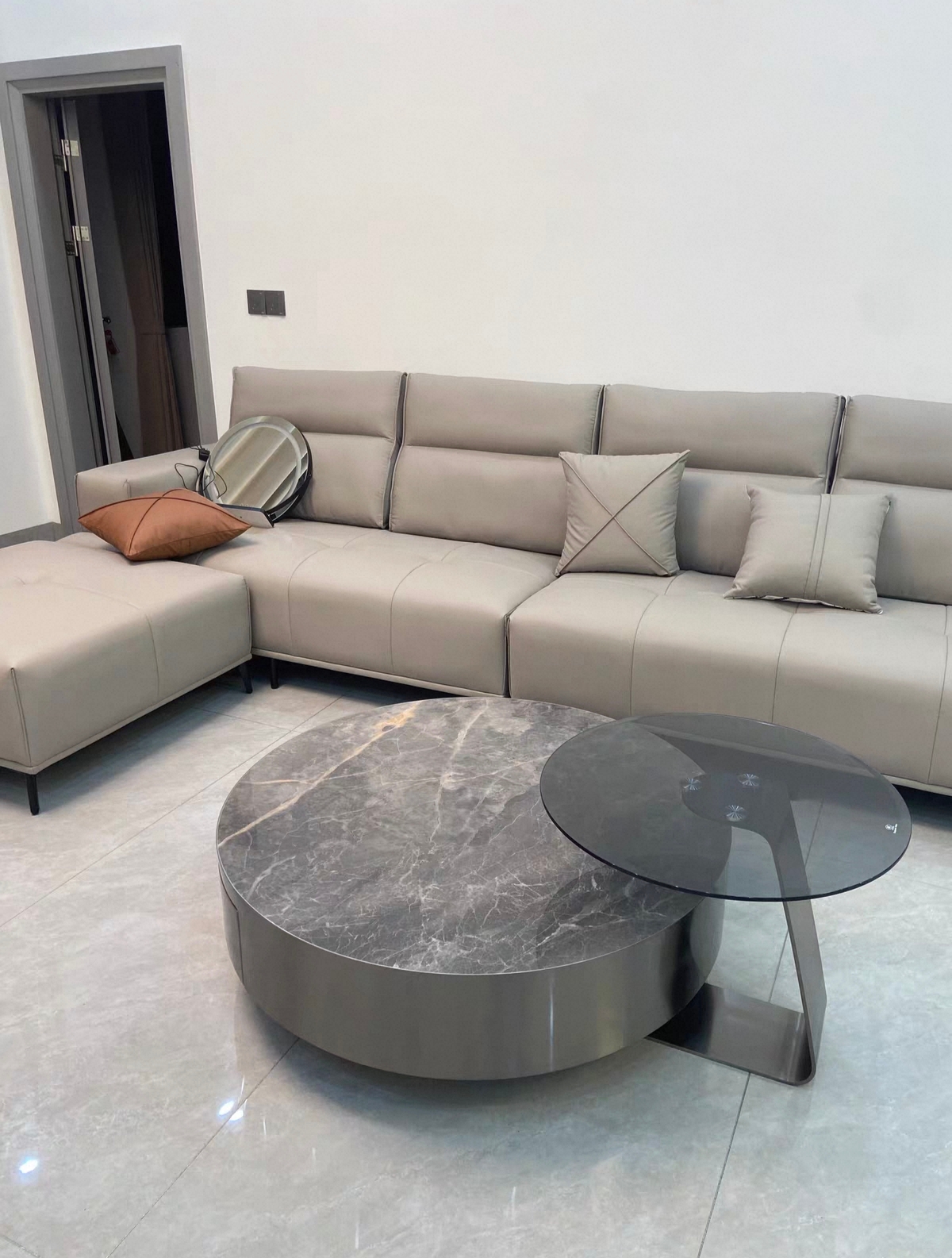 很物美价廉的一款茶几,小玻璃茶几可以单独放沙发边用,嫌碍事可以跟岩板重叠不占位置