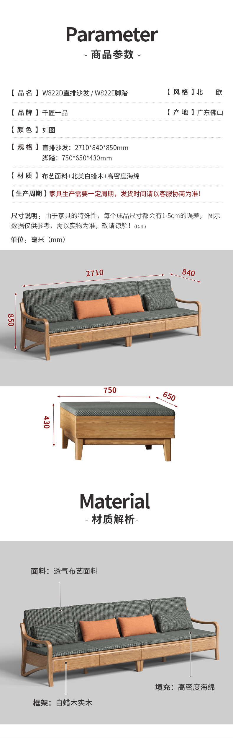 商品名称:千匠一品 北欧风格 布艺面料+北美白蜡木+高密度海绵 时尚大气沙发W822-J