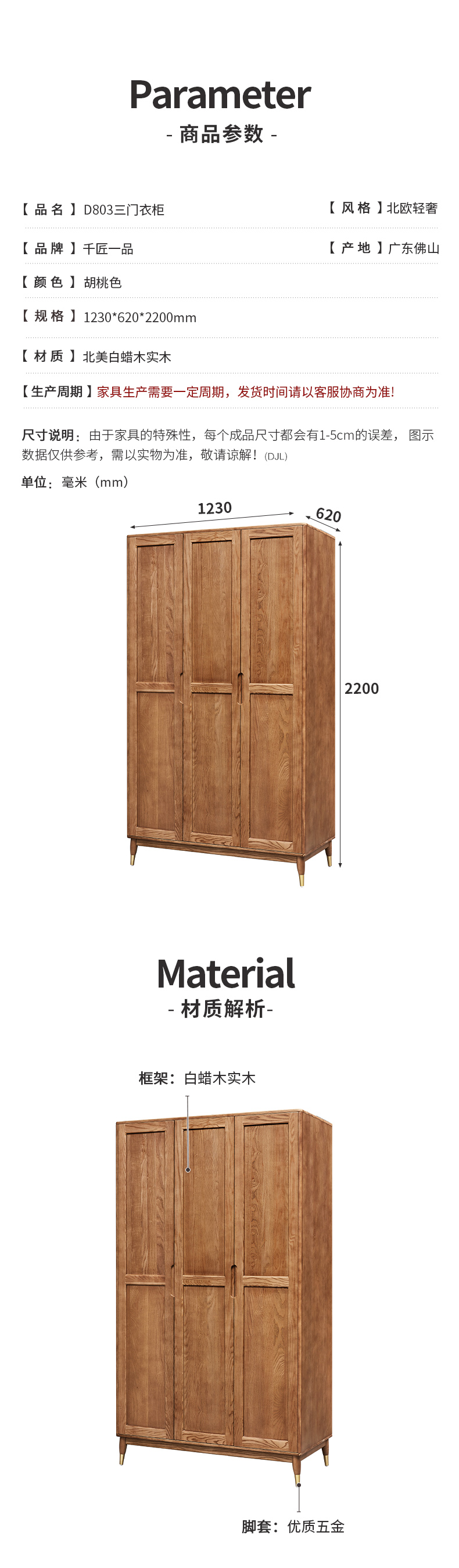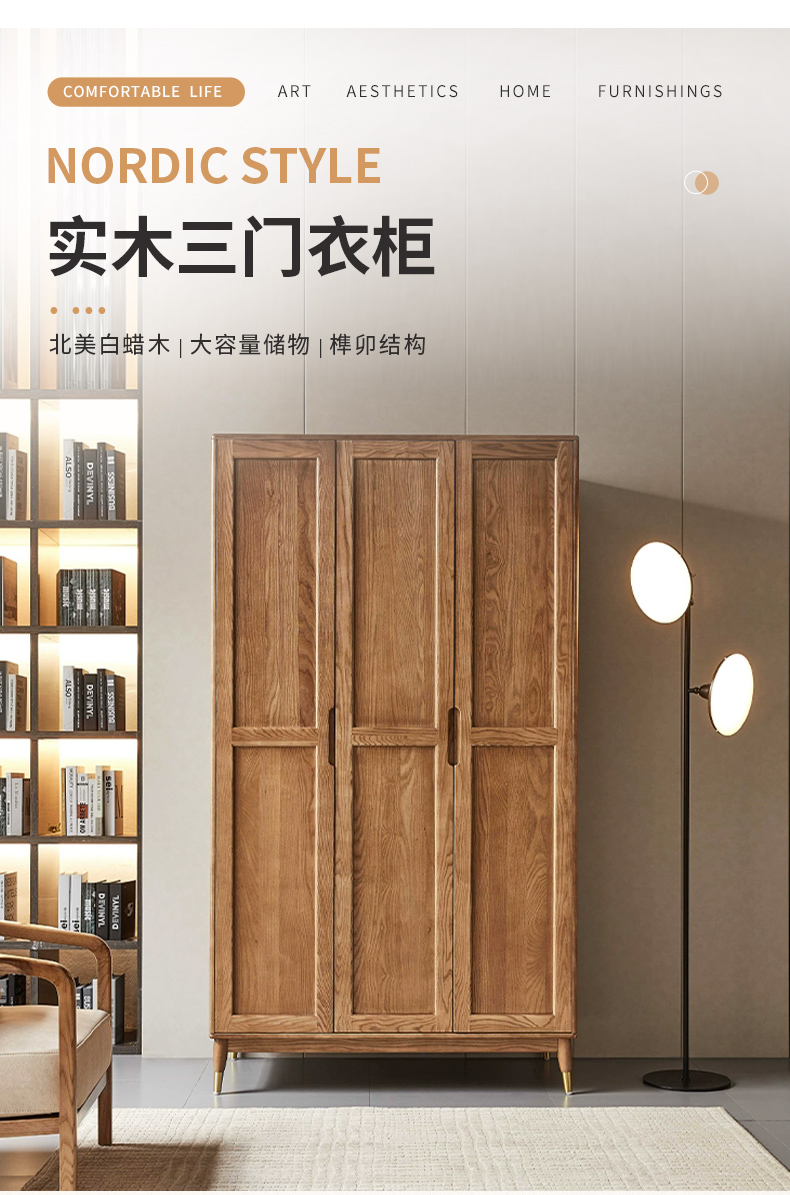 商品名称:千匠一品 北欧风格 北美白蜡木实木 时尚大气三门衣柜D803-J