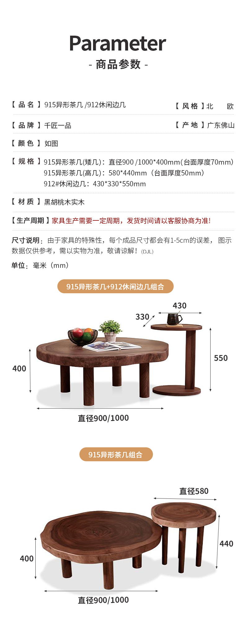 商品名称:千匠一品 北欧风格 黑胡桃木实木 时尚大气异形茶几915 休闲边几 912-J