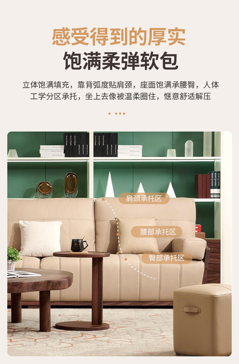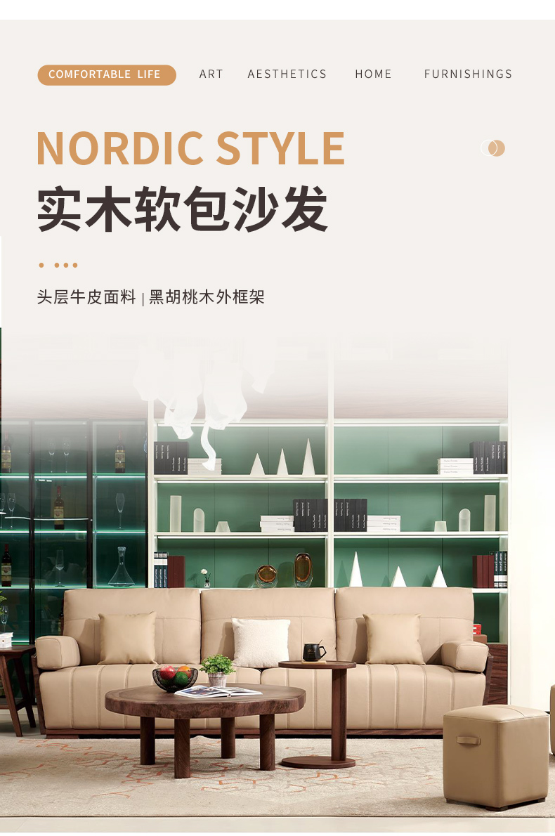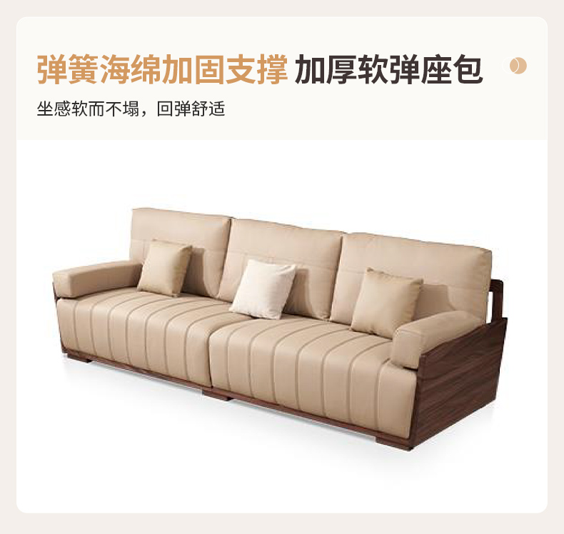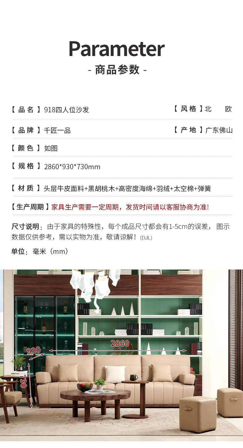 商品名称:千匠一品 北欧风格 头层牛皮面料+黑胡桃木+高密度海绵+羽绒+太空棉+弹簧 时尚大气沙发918-L