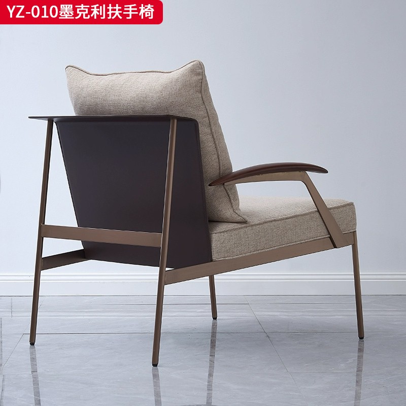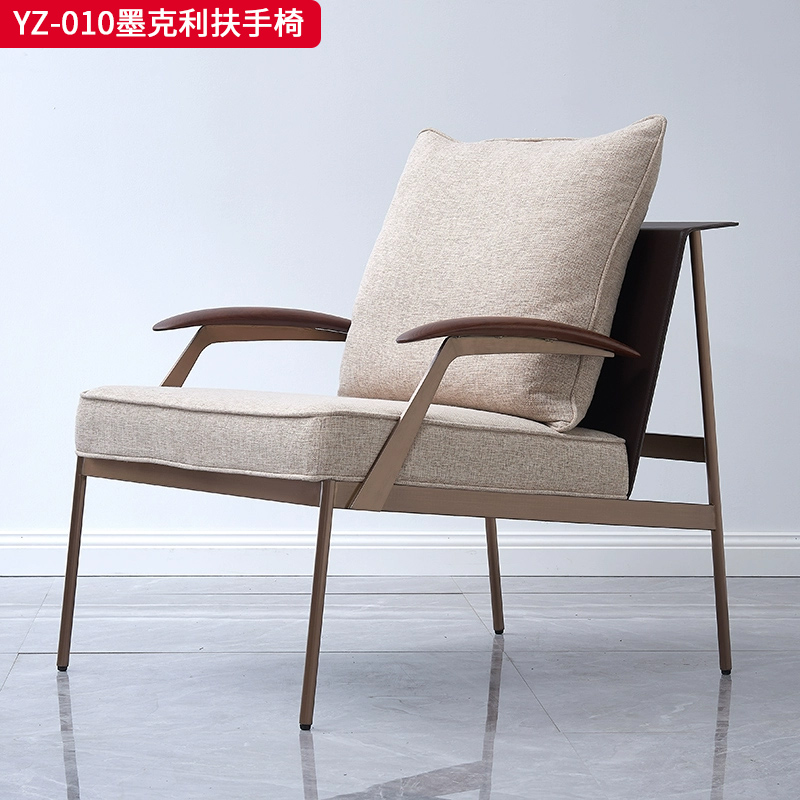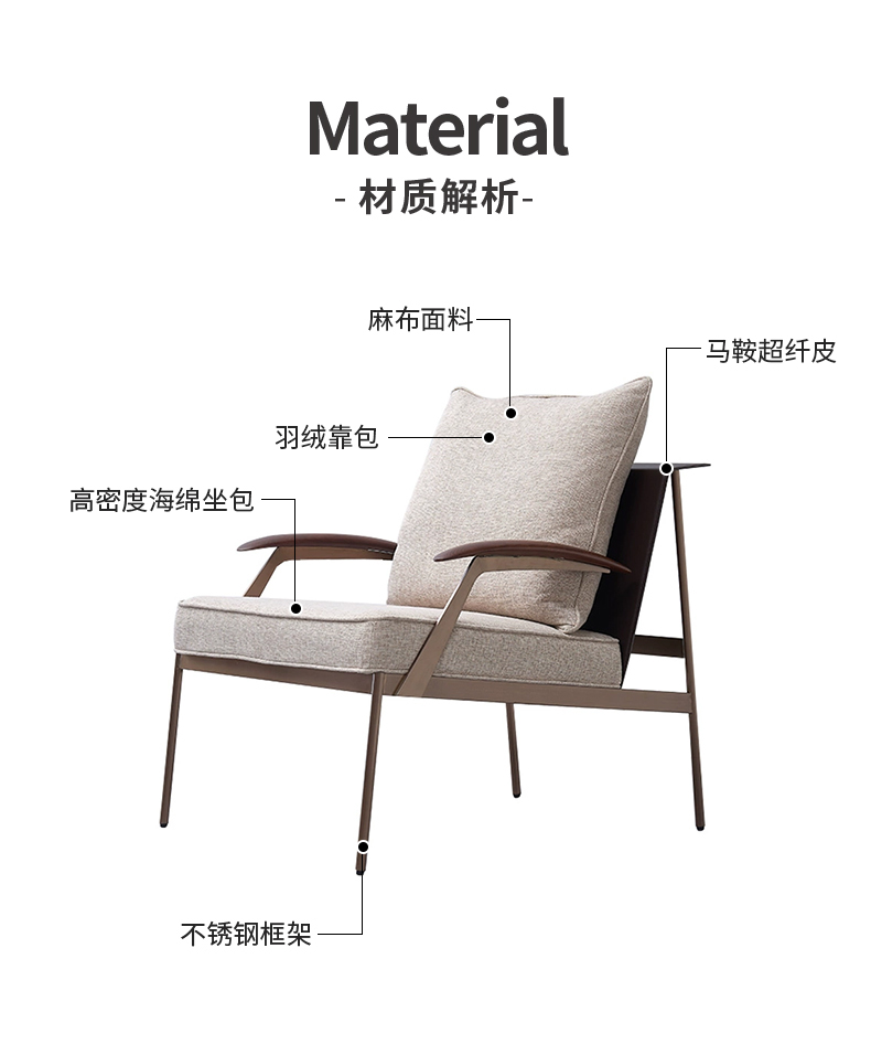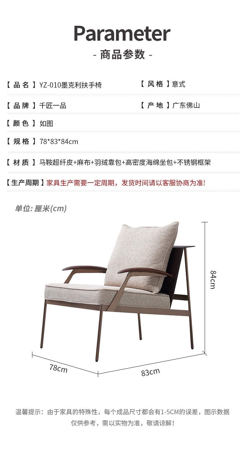 商品名称:千匠一品 意式风格 马鞍超纤皮+麻布+羽绒靠包+高密度海绵座包+不锈钢框架 时尚大气墨克利扶手椅YZ-010-J