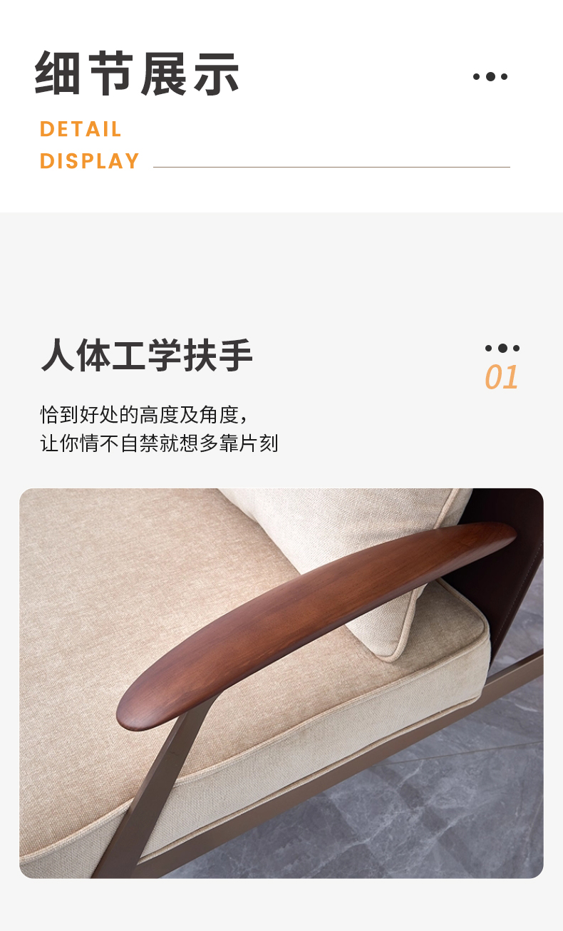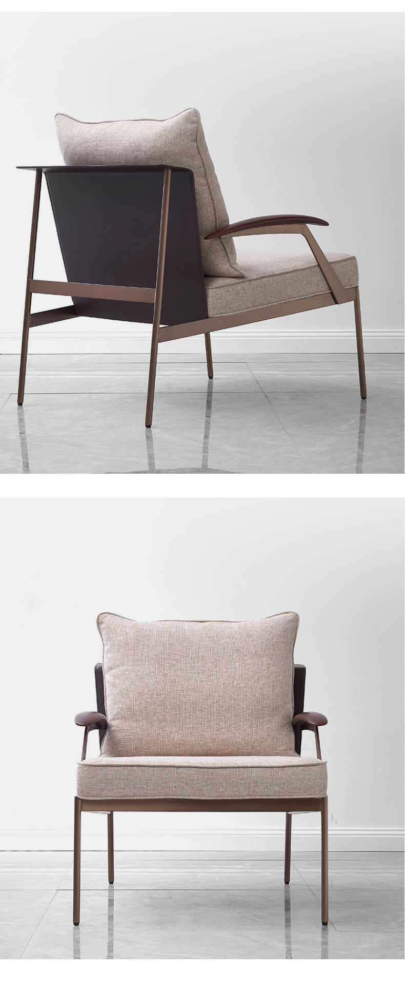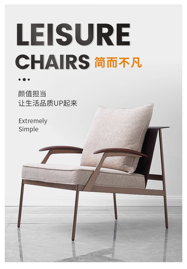 商品名称:千匠一品 意式风格 马鞍超纤皮+麻布+羽绒靠包+高密度海绵座包+不锈钢框架 时尚大气墨克利扶手椅YZ-010-J