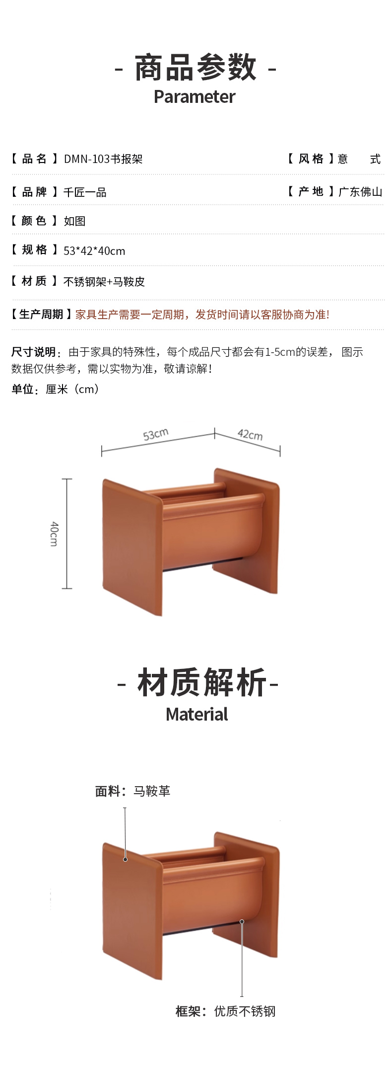 商品名称:千匠一品 意式风格 不锈钢架+马鞍皮 时尚大气书报架DMN-103-J