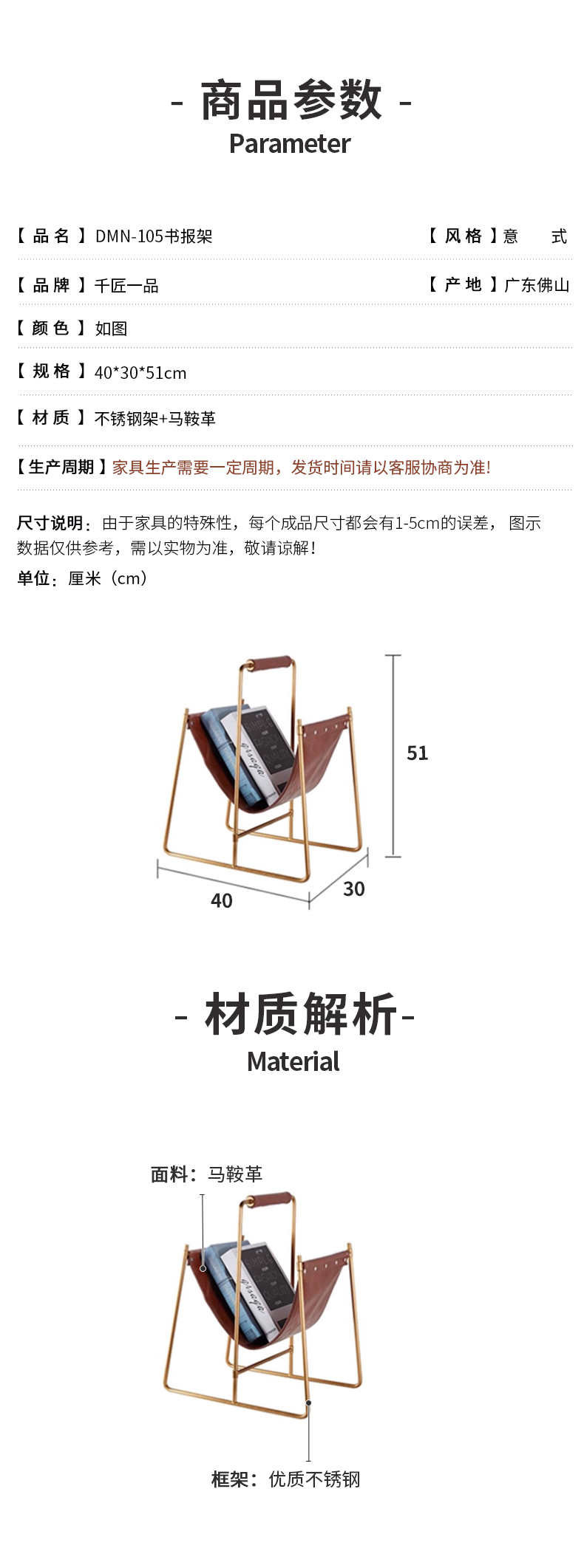商品名称:千匠一品 意式风格 不锈钢架+马鞍革 时尚大气书报架DMN-105-J