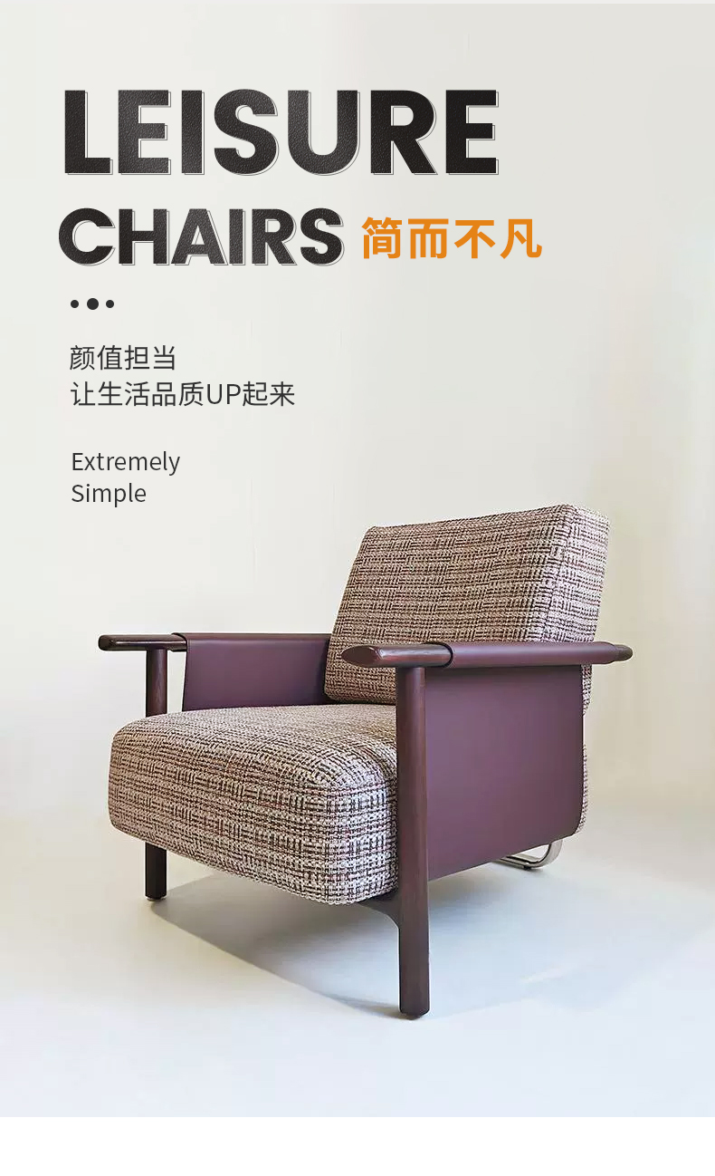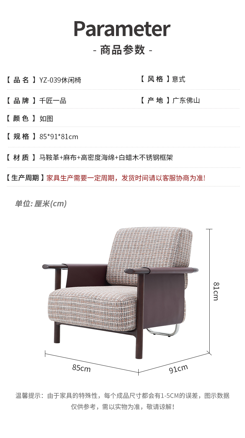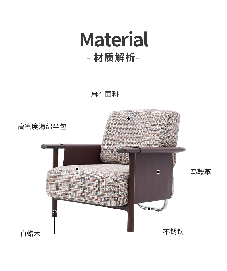 商品名称:千匠一品 意式风格 马鞍革+麻布+高密度海绵+白蜡木不锈钢框架 时尚大气休闲椅YZ-039-J