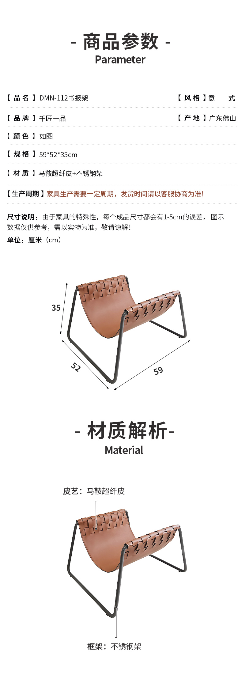 商品名称:千匠一品 意式风格 马鞍超纤皮+不锈钢架 时尚大气书报架DMN-112-J