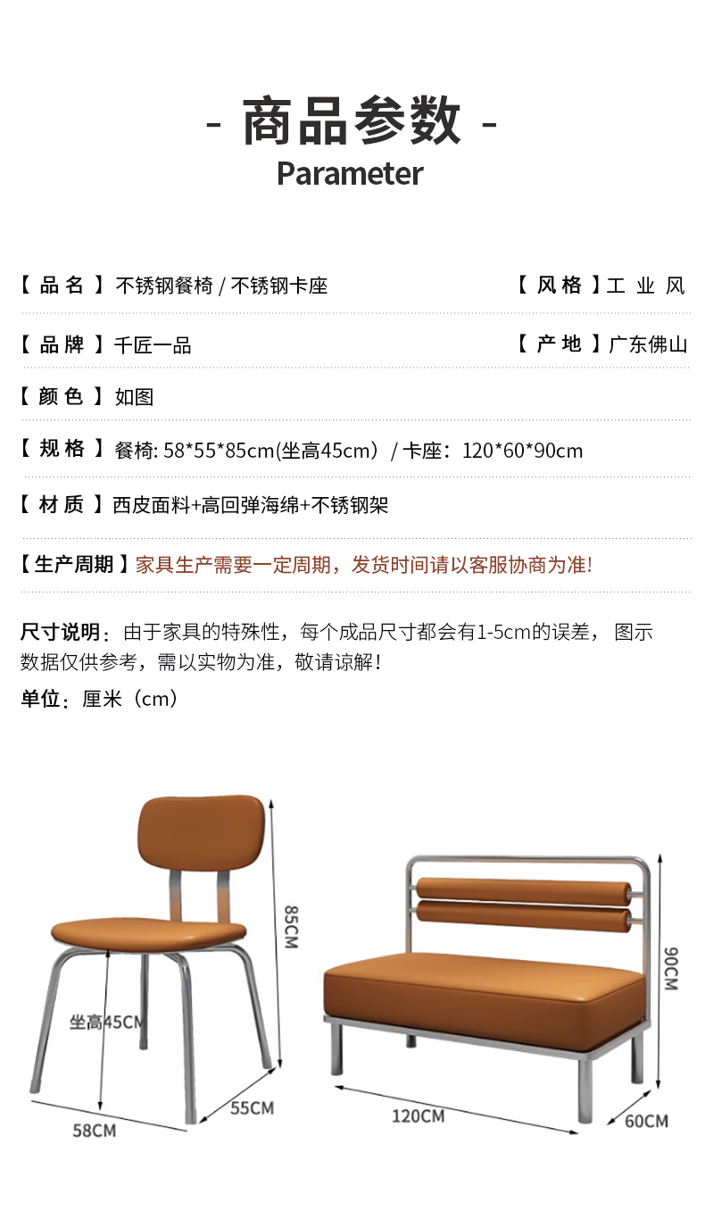 商品名称:千匠一品 工业风风格 西皮面料+高回弹海绵+不锈钢架 时尚大气不锈钢餐椅不锈钢卡座-J