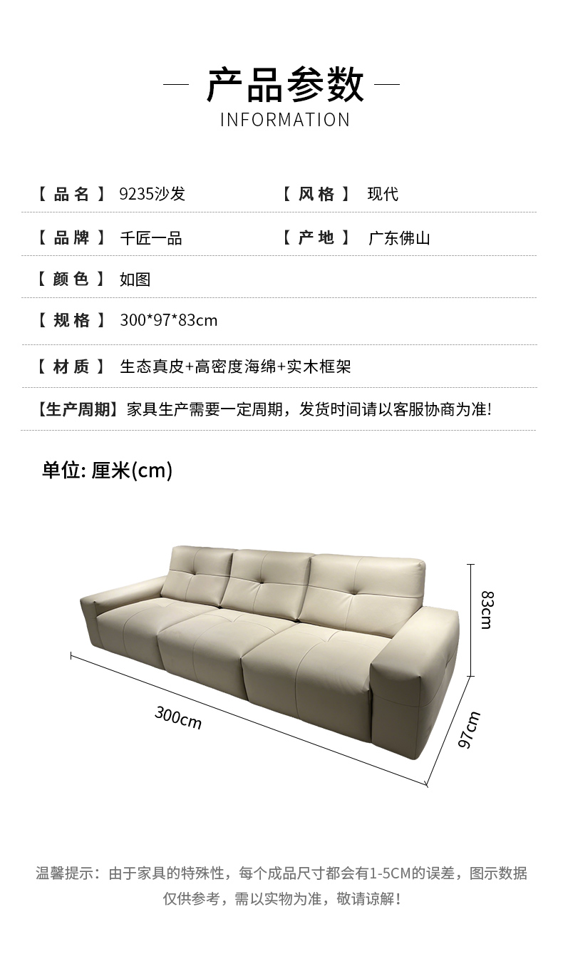 商品名称:千匠一品 现代风格 生态真皮+高密度海绵+实木框架 时尚简约沙发9235-L
