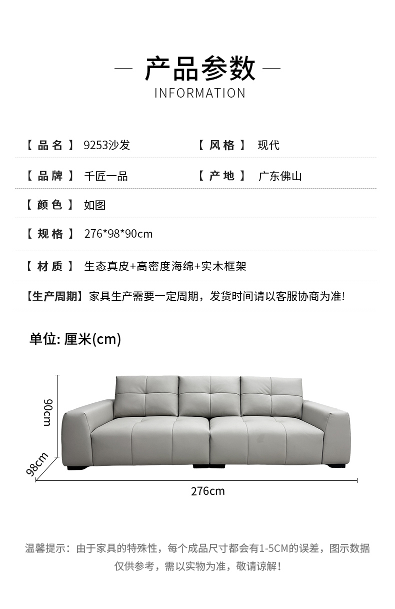 商品名称:千匠一品 现代风格 生态真皮+高密度海绵+实木框架 时尚大气沙发9253-J