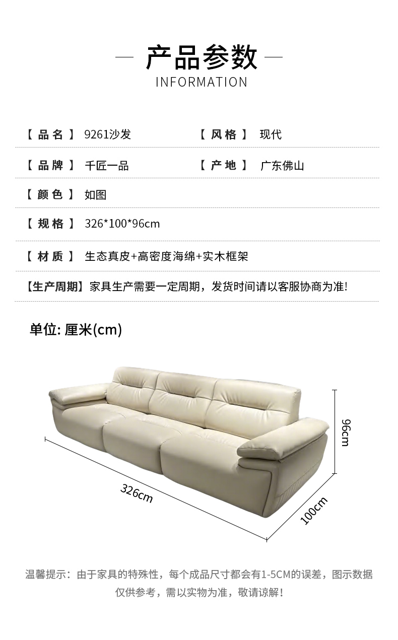 商品名称:千匠一品 现代风格 生态真皮+高密度海绵+实木框架 时尚大气沙发9261-J