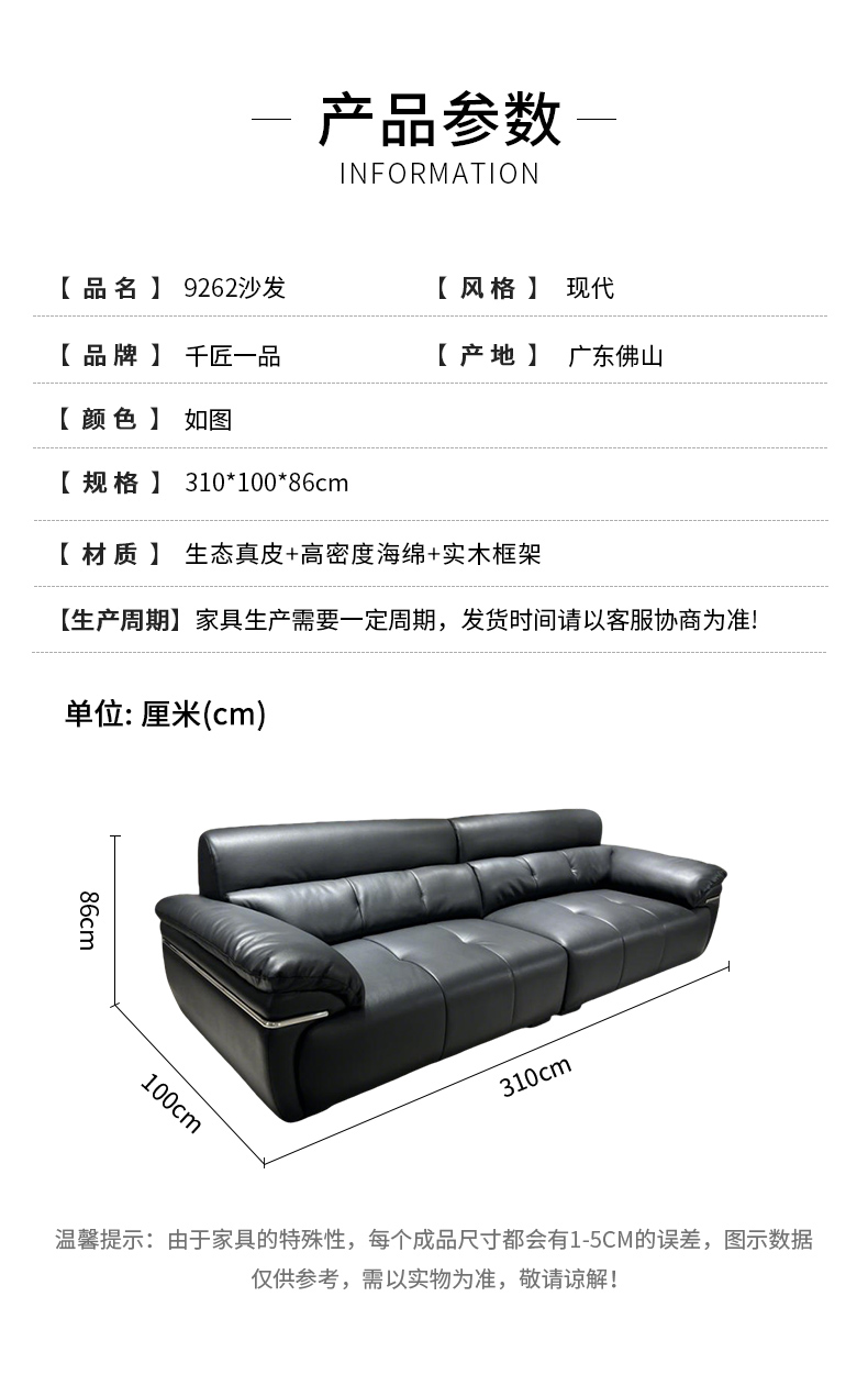 商品名称:千匠一品 现代风格 生态真皮+高密度海绵+实木框架 时尚大气沙发9262-J