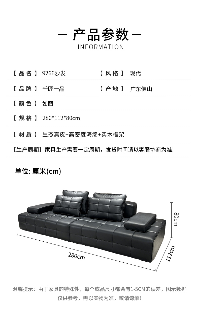 商品名称:千匠一品 现代风格 生态真皮+高密度海绵+实木框架 时尚大气沙发9266-J