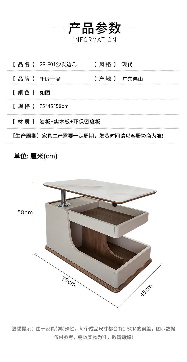 商品名称:千匠一品 现代风格 岩板+实木板+环保密度板 时尚简约沙发边几28-F01-L